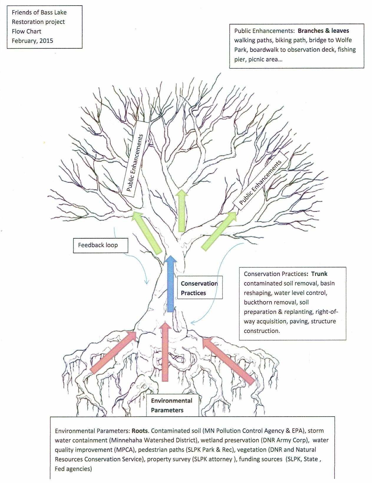 Friends of Bass Lake is committed to helping the City of St. Louis Park educate, inform and enlist citizens in the effort to support the restoration of Bass Lake. The diagram below illustrates how Friends of Bass Lake understands the complex restoration process. Click the 'flow chart detail' button for the complete 2015 inter-agency and process breakdown.